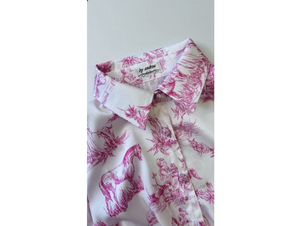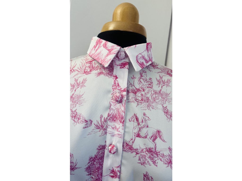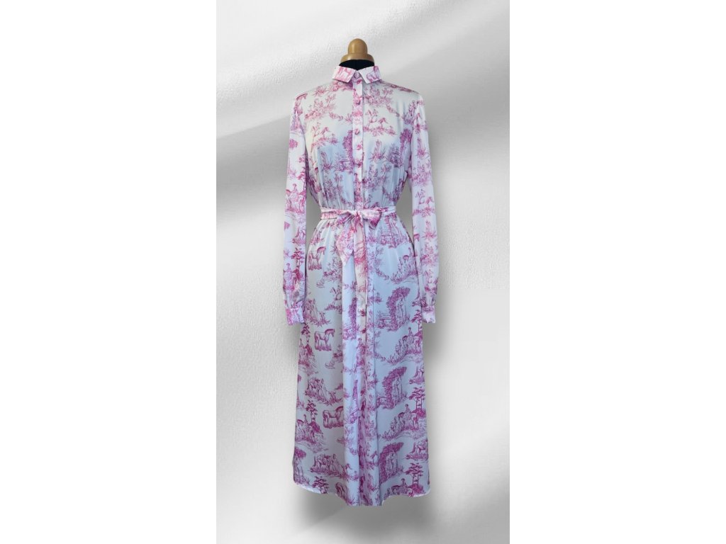 Vzor je inspirován francouzským módním domem Dior, vzor Toile de Jouy. Stejnou látkou potažené knoflíky doplní elegantní styl. Celková délka šatů 110 cm, délka rukávu 63 cm.